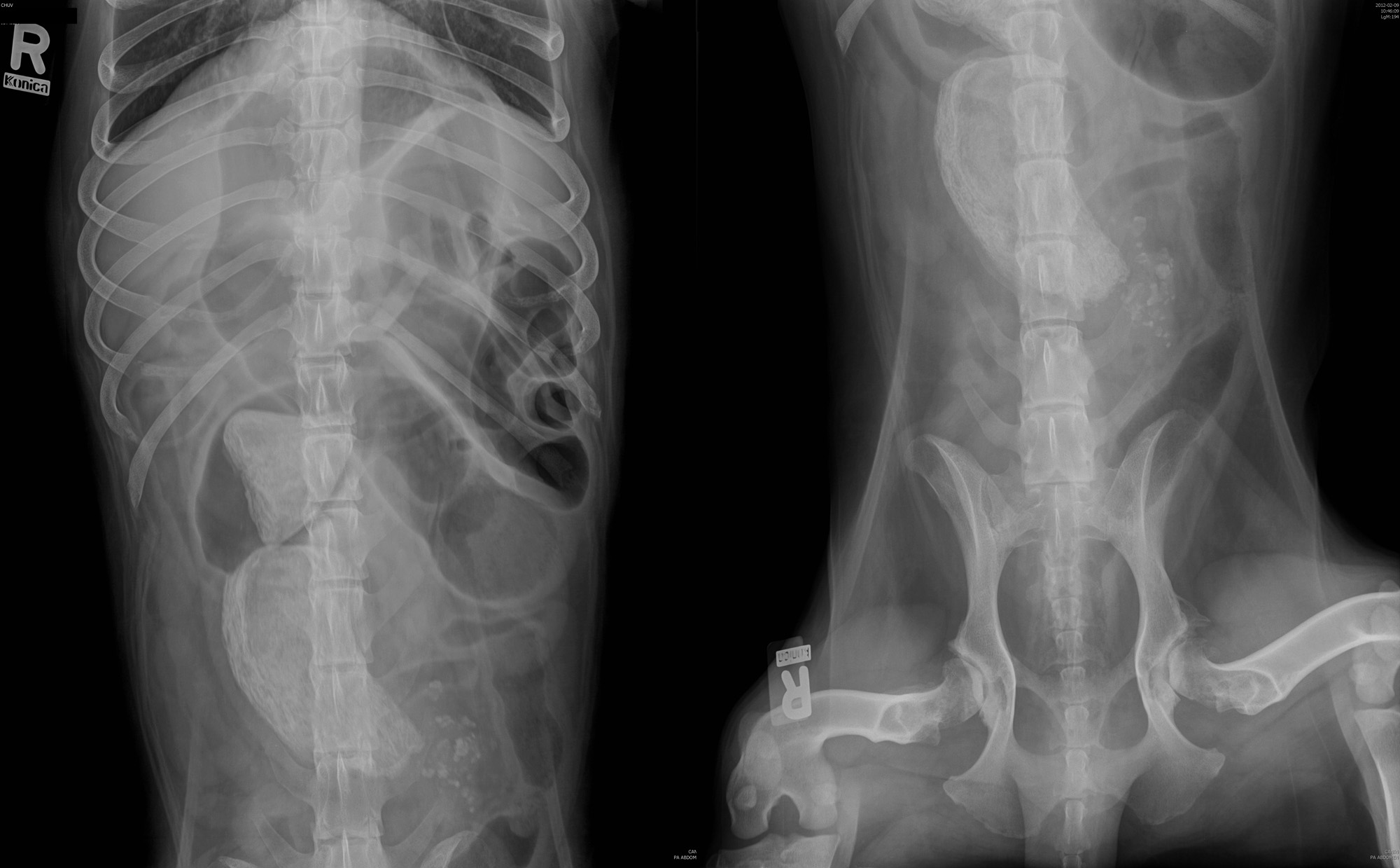 Histoire clinique: Amaigrissement progressif depuis 3 mois, avec courts épisodes de selles liquide, mais sans vomissement. Hypoprotéinémie.