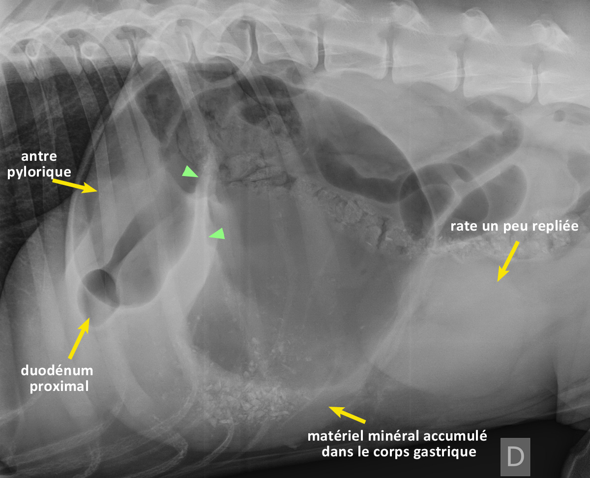 Eh oui… il est tordu cet estomac. Remarquez la position de l’antre pylorique, qui se retrouve crâniodorsalement, séparée du corps gastrique par une bande de tissu (têtes de flèches vertes) créant deux compartiments. La rate est poussée caudalement et semble arrondie, possiblement en raison d’une congestion veineuse, ou parce qu’elle est repliée partiellement sur elle-même.