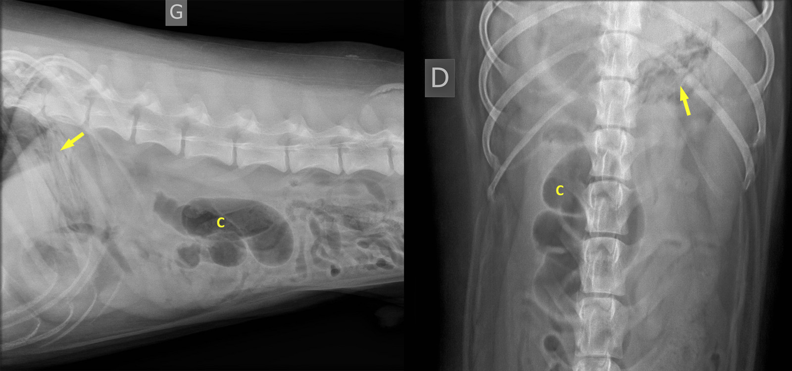 Sur ces radiographies, ce qu’il fallait reconnaître est la série de lignes d’opacité tissulaire à minérale à l’intérieur du fondus gastrique (flèches). Outre le fait que l’antre pylorique comportait un peu de gaz, il n’y avait pas de réel signe d’obstruction. Le détail abdominal était relativement bon et le duodénum n’était pas anormalement dilaté, ce qui n’exclut pas la possibilité de pancréatite, mais du moins, aucun signe radiographique suggérait cette possibilité. Le petit intestin ne comportait pas une quantité anormale de liquide ou d’air. Le segment rempli d’air (C) au centre-droit de l’abdomen avait la forme et la position du cécum et d’une portion du côlon. Lors de volvulus intestinal, on s’attend normalement à observer une dilatation intestinale marquée et de l’épanchement péritonéal, ce qui n’était pas le cas. Une échographie s’imposait alors pour aller vérifier l’estomac et exclure plus définitivement la possibilité de corps étranger intestinal ou de pancréatite.