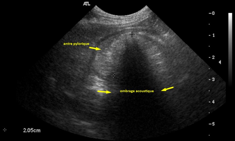 L’échographie a d’abord révélé un estomac rempli de liquide et de matériel hyperéchogène en région déclive (Image écho 1), puis une structure hyperatténuante provoquant un ombrage acoustique presque complet dans le corps et l’antre de l’estomac (Images écho 2 et 3). Comme la nourriture normale ne devrait pas engendrer d’ombrage complet (à ne pas confondre avec un ombrage trouble souvent associé à la présence de nourriture et d’air), ce signe a été interprété comme signe convaincant de corps étranger ! Comme ce corps étranger était mobile, il a bougé entre les radios et l’échographie.