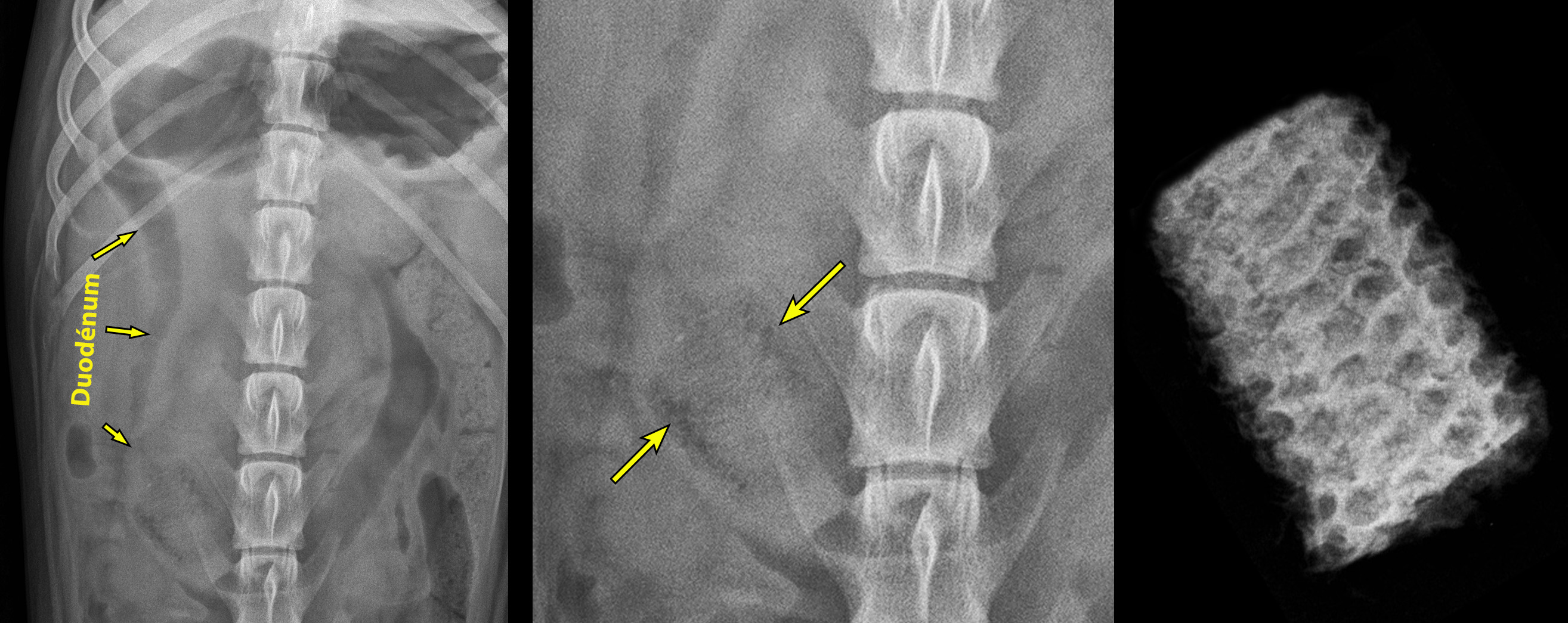 Le duodénum montre une quantité excessive de liquide et d’air, formant un patron semi-fragmenté (flèches sur l’image de gauche). En portion caudale du duodénum descendant, on peut voir une structure déformant la lumière du duodénum et montrant multiples petites logettes aériques, plus évidentes en périphéries latérales (flèches sur l’image centrale magnifiée). L’apparence de cette structure est compatible avec un petit segment d’épi de maïs (ou de blé d’inde si comme moi vous habitez le Québec). À droite, on peut voir l’apparence radiographique d’un autre segment d’épi, celui-ci entouré d’air (gracieuseté de Kate Alexander).