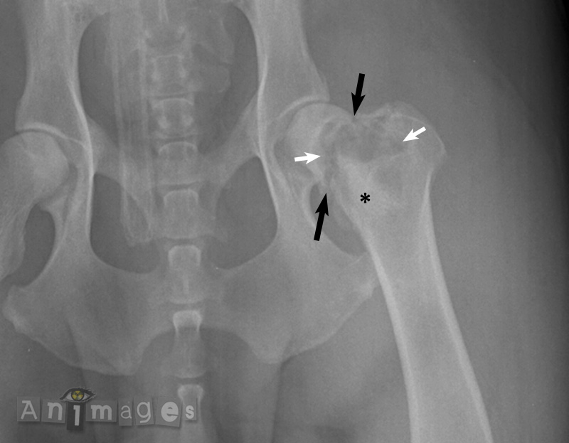 Il s’agissait en effet d’une lésion osseuse agressive. Celle-ci se caractérise par une zone de lyse mitée à géographique (flèches blanches) dans la métaphyse proximale du fémur, au contour mal défini et irrégulier, et accompagnée d’une prolifération osseuse mal définie superposée à la médulla à sa marge distale (*). La métaphyse est déformée et raccourci, alors qu’un défaut cortical est évident crânialement et caudalement (flèches noires), indiquant une fracture pathologique. Celle-ci est survenu en raison de la fragilité de l’os engendrée par le processus agressif. Les caractéristiques et la localisation de cette lésion, couplées au signalement et aux données cliniques de l’animal, sont compatibles avec une tumeur osseuse maligne primaire (ostéosarcome, fibrosarcome ou chondrosarcome) ou encore une tumeur d’une autre lignée cellulaie, tel un sarcome histiocytaire. Techniquement, une ostéomyélite aurait pu être considérée sur la base de cette image, mais collait moins bien avec l’histoire clinique et la loi des chiffres (i.e. la probabilité de rencontrer une ostéomyélite chez un animal mature, dans la métaphyse fémoral proximale, comparativement à une tumeur osseuse primaire). Un ostéosarcome a finalement été confirmé.