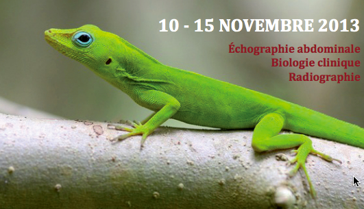 Si ça vous dit de joindre l’utile à l’agréable, accompagnez Franck Durieux, Olivier Toulza et MA d’Anjou pour une semaine sous le soleil en Martinique en novembre prochain. Au menu ? Échographie pratique et théorique, interprétation radiographique, biologie clinique (pathologie clinique)… et plongée sous-marine ! Pour plus de détail, visitez Formation dans les Antilles 2013, consulter le dépliant ou pour les Canadiens, accédez directement au formulaire d’inscription.