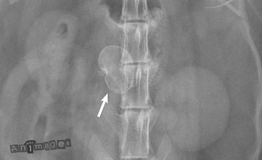 Cette opacité minérale n’avais rien à avoir avec les néphrons, mais avec les adipocytes qui, sans raison apparente, se mettent à nécroser, puis à calcifier. Ce processus laisse une petite masse – ou parfois plusieurs – dans la cavité abdominale de certains chiens et chats, plutôt vieux et obèses. La forme de coquille au contour lisse – ou parfois lobulé – est typique sur les radiographies. À ne pas confondre avec une tumeur ou granulome qui se calcifient généralement de façon plus hétérogène – lorsqu’il le font – ou avec un corps étranger. La localisation extra-digestive était peut-être évidente dans ce cas-ci, mais attention, ce n’est pas toujours le cas ! Cette nécrose adipeuse peut impliquer le ligament falciforme, le mésentère, l’omentum ou autre structure graisseuse dans l’abdomen. Évidemment, si c’était un lapin, on aurait tout de suite penser à un oeuf, mais bon 😉