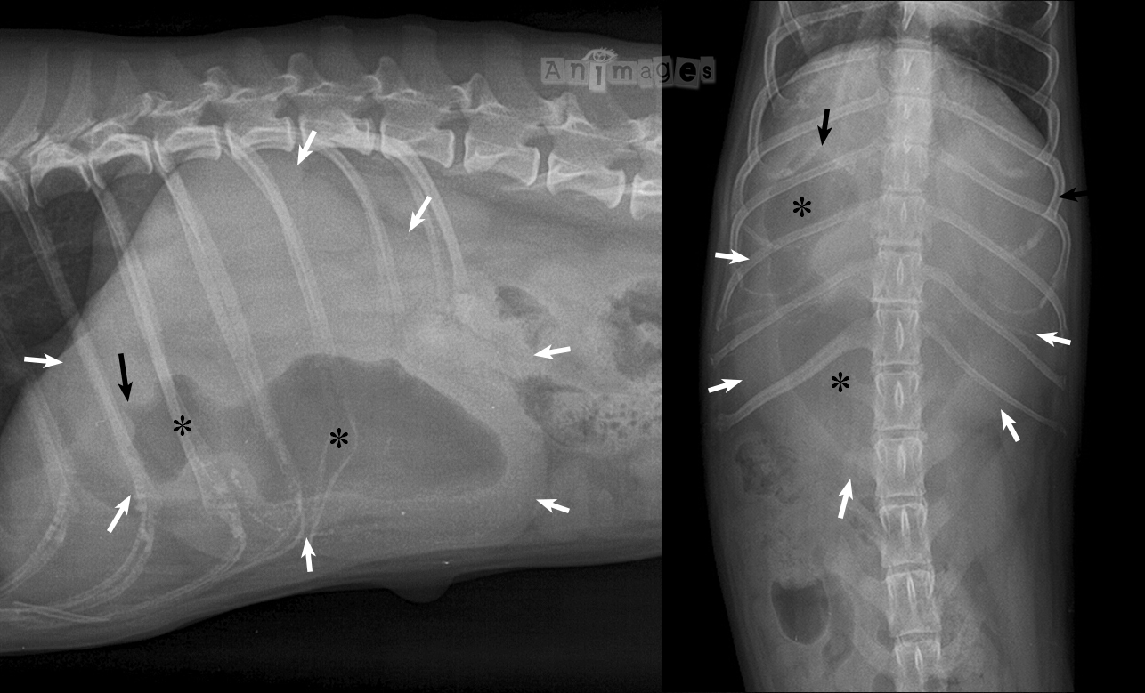 La masse d’opacité de type tissus mous (flèches blanches) qui occupe près de la moitié de l’abdomen crânial de ce chien représente un estomac rempli de liquide, avec une bulle d’air au contour irrégulier (*) qui occupe une partie du corps de l’estomac et de l’antre pylorique. Cette bulle d’air montre une forme de bec d’oiseau à l’entrée du canal pylorique (flèche noire), laquelle est caractéristique d’un épaississement pariétal obstructif faisant protrusion dans la lumière. Chez les petites races avec une histoire de vomissements chroniques, ces signes radiographiques sont assez typiques de gastrite chronique avec hyperplasie mucosale à l’entrée du pylore provoquant un retard de vidange gastrique et une dilatation subséquente du reste de l’estomac (voir l’illustration ci-bas).