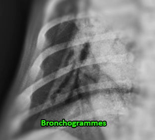 Il s’agissait – comme la majorité d’entres vous le suspectiez – d’un mégaoesophage congénital. L’oesophage (flèches jaunes) est sévèrement dilaté par de la nourriture, déplaçant et comprimant la trachée ventralement. La VD révèle également un patron alvéolaire au lobe moyen droit avec de beaux bronchogrammes aériques (voir image magnifiée), compatible avec une pneumonie par aspiration (fausse déglutition). Pourquoi ce patron n’est pas reconnu sur la latérale ? Simplement parce qu’il s’agissait d’une latérale droite qui force le poumon droit à s’affaisser au profit du poumon gauche, limitant ainsi le contraste radiographique nécessaire à la distinction de cette pathologie. On remarque aussi sur la VD la silhouette du thymus formant un signe de « voile » s’étendant vers la gauche.