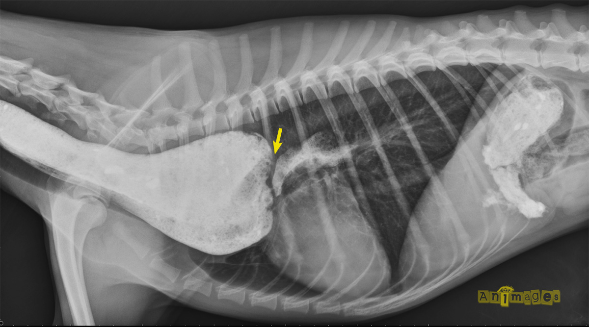 Lors d’anomalies vasculaire constrictive – une persistance de la 4e arche aortique étant la principale anomalies rencontrée chez le chien (comme ci-bas, après administration de baryum liquide) -, l’oesophage n’est généralement dilaté que crânialement au site d’obstruction (flèche jaune), bien que sa portion caudale puisse aussi devenir dysfonctionnelle et dilater, mais en laissant un site de rétrécissement à la base du coeur. L’estomac semble en place dans ce cas-ci, excluant une intussusception gastro-oesophagienne. Une obstruction oesophagienne caudale (corps étranger ou stricture) représentait un diagnostic différentiel plausible.