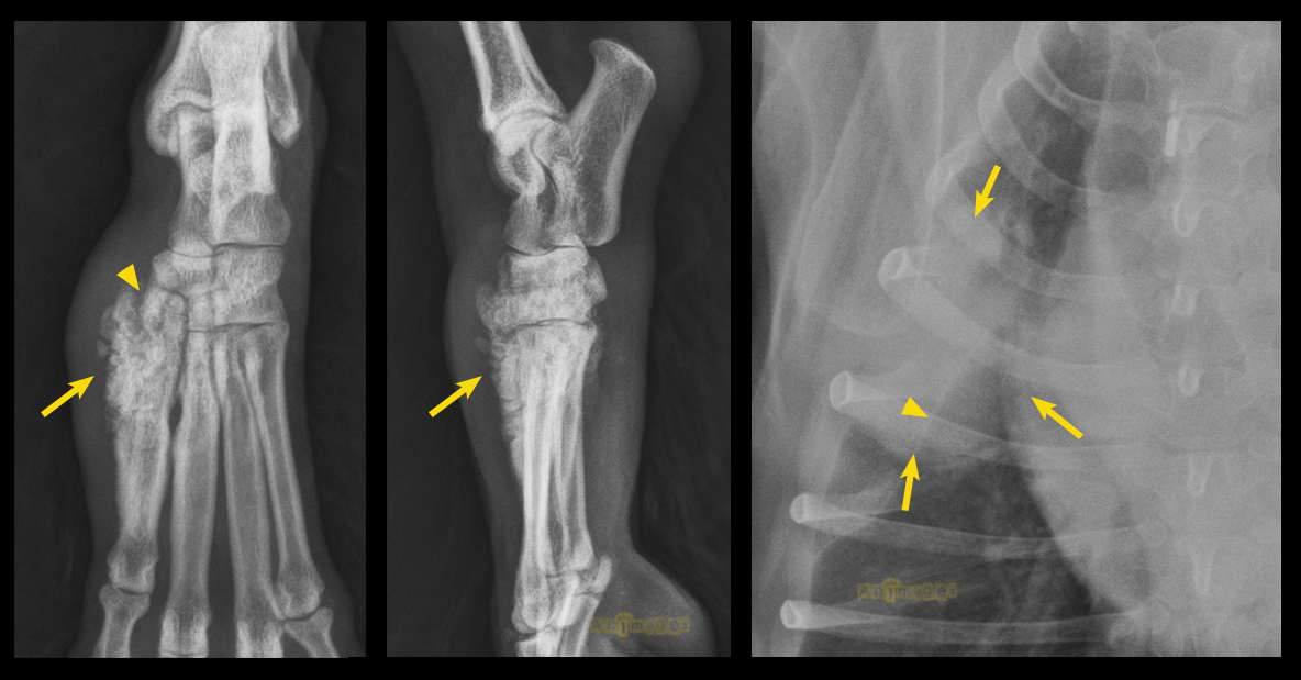 La possibilité d’ostéopathie hypertrophique fut considérée, mais celle-ci ne provoque généralement pas de lyse osseuse et implique typiquement les membres de façons symétriques et les faces axiales et abaxiales des os appendiculaires (bien que ce ne soit pas toujours le cas). En voici deux beaux exemples (chiens avec masse pulmonaire – à gauche – et masse oesophagienne – à droite).