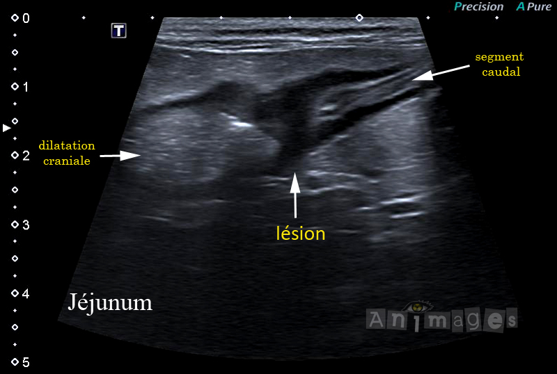 Il était une fois Benoit, un siamois mâle opéré de 11 ans, référé pour une échographie abdominale dans le but d’investiguer une perte d’appétit et une léthargie durant depuis maintenant 3 à 4 semaines, le tout ayant débuté par des vomissements projectiles. Les vomissements persistent depuis. L’examen démontre que Benoit est abattu, déshydraté et inconfortable à la palpation abdominale. Son profil sanguin n’indique alors qu’une légère anémie (HT 27%) avec une légère hausse des bilirubines totales et une légère baisse des protéines totales (alb/glob = 30/26). L’examen échographique de l’abdomen révèle, entre autres, un phénomène obstructif, impliquant le jéjunum, associé à une lésion pariétale focale, circonférentielle et sténosante (image ci-dessous). La paroi affectée est hypoéchogène et il y a perte de distinction de ses couches. Cranialement il y a accumulation d’ingesta (signe du gravier) et hypertrophie de la musculeuse intestinale indiquant ainsi une lésion chronique et progressive. Caudalement l’intestin est vide de contenu. Ces changements sont accompagnés d’une légère lymphadénomégalie régionale.
