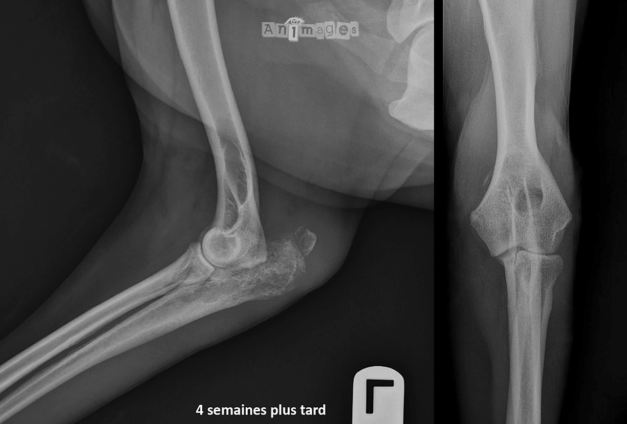 Pas grand chose n’est-ce pas ? Comme la boiterie de Fugasse progressait sans répondre aux anti-inflammatoires, de nouvelles radiographies ont été prises 4 semaines plus tard…