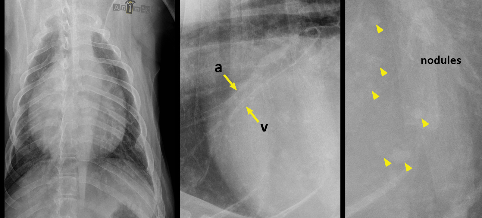 Oscar était mal en point… 54,2% d’entres vous aviez vu juste au moment d’écrire ces lignes. L’aspect globuleux de la silhouette cardiaque était bien suggestive d’épanchement péricardique. La petitesse des artères (a) et veines (v) pulmonaires crâniales appuyaient aussi une hypothèse de tamponade cardiaque davantage que celle d’une insuffisance cardiaque congestive. Et pour finir, de multiples opacités de tissus mous plus ou moins circulaires étaient présentes, suggérant fortement des métastases. Celles-ci étaient peut-être plus difficiles à percevoir sur vos écrans (seulement 2,3% d’entres vous en ont fait état… mais peut-être ne saviez-vous pas que vous pouviez sélectionner plusieurs signes radiographiques dans la liste ?).