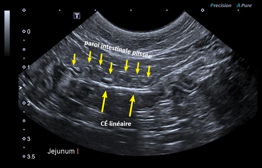 Quelle devrait donc être la prochaine étape diagnostique afin de confirmer la suspicion radiographique de corps étranger linéaire ? Lorsque disponible, l’échographie abdominale est le test diagnostique de choix pour la détection et la caractérisation des corps étrangers linéaires. Ce test est rapide, peu invasif et permet de localiser le corps étranger, de déterminer la portion du tractus gastro-intestinal affecté et d’évaluer l’intégrité des parois digestives.3 La série barytée gastro-intestinale haute, qui consiste en l’administration oral d’un milieu de contraste tel que le baryum suivi de la prise de radiographies à des intervalles régulières, peut être considérée dans les cas où l’échographie n’est pas disponible. Quelques désavantages sont inhérents à cette technique. Par exemple, en cas de perforation digestive, la fuite de baryum dans la cavité abdominale peut être très irritante et mener à la formation de granulomes ou d’adhérences.3 De plus, cet examen peut être long à effectuer et nécessite un protocole rigoureux (dose et temps) pour être fiable.3 Ces désavantages peuvent mener à un délai dans l’initiation d’une intervention chirurgicale et peuvent occasionner des complications additionnelles.3 Néanmoins, cet examen peut être très utile pour mettre en évidence la plication caractéristique du corps étranger linéaire lorsque l’échographie abdominale n’est pas disponible.