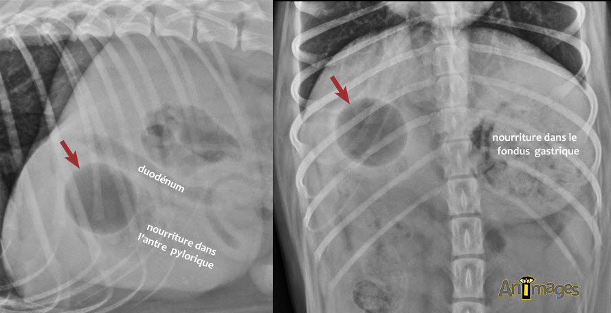 La visite de nombreux vétérinaires et TSA au kiosque pour se prononcer sur le petit quiz publié la semaine dernière nous a fait réalisé que nous n’étions pas les seuls passionnés du diagnostic radiographique ! La moitié des participants ont vu juste: ce chien avait mangé une petite balle de plastique remplie d’air qui se longeait dans l’antre pylorique, en compagnie de nourriture (cliquez sur l’image pour une vue plein écran). Remarquez la forme parfaitement circulaire et de taille identique sur les deux projections !