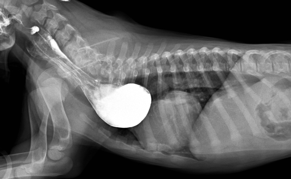Ces signes radiographiques sont compatibles avec une persistance de la 4e arche aortique qui provoque une compression oesophagienne et une dilatation marquée de sa portion médiastinale crâniale au coeur. Un peu de baryum a été donné pour confirmer la compression de l’oesophage à la base du coeur, mais le déplacement de la trachée vers la gauche sur la VD était déjà diagnostique de la persistance de la 4e arche aortique, comme l’a démontré l’étude de Buchanan (1).