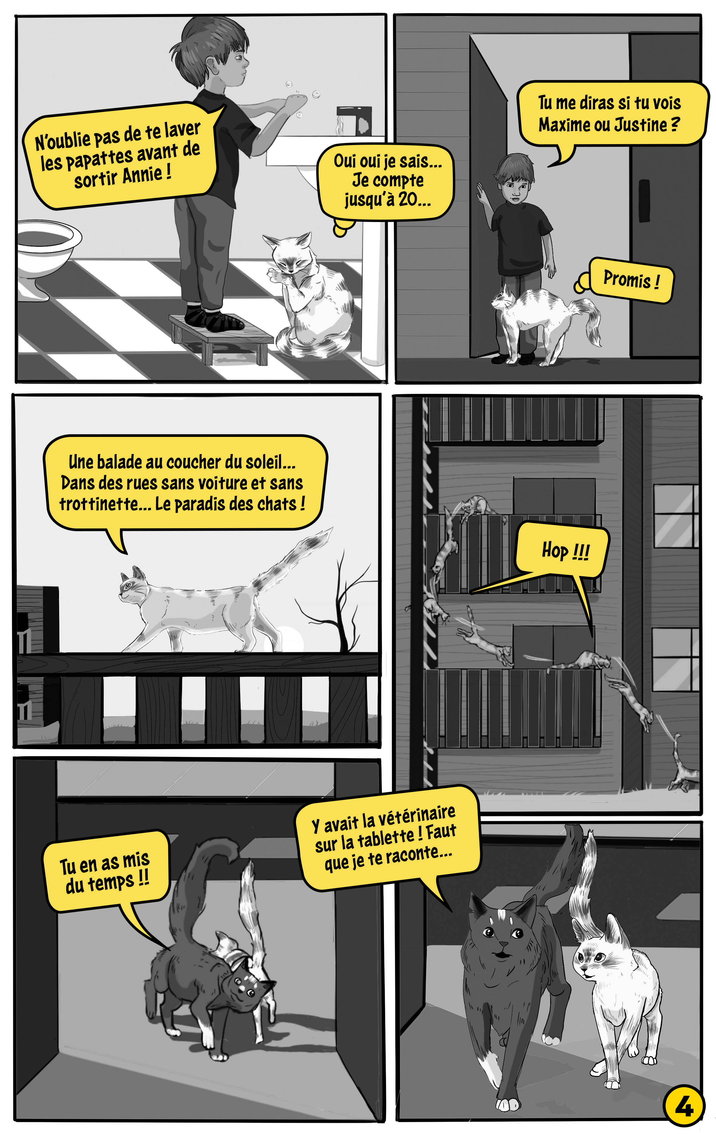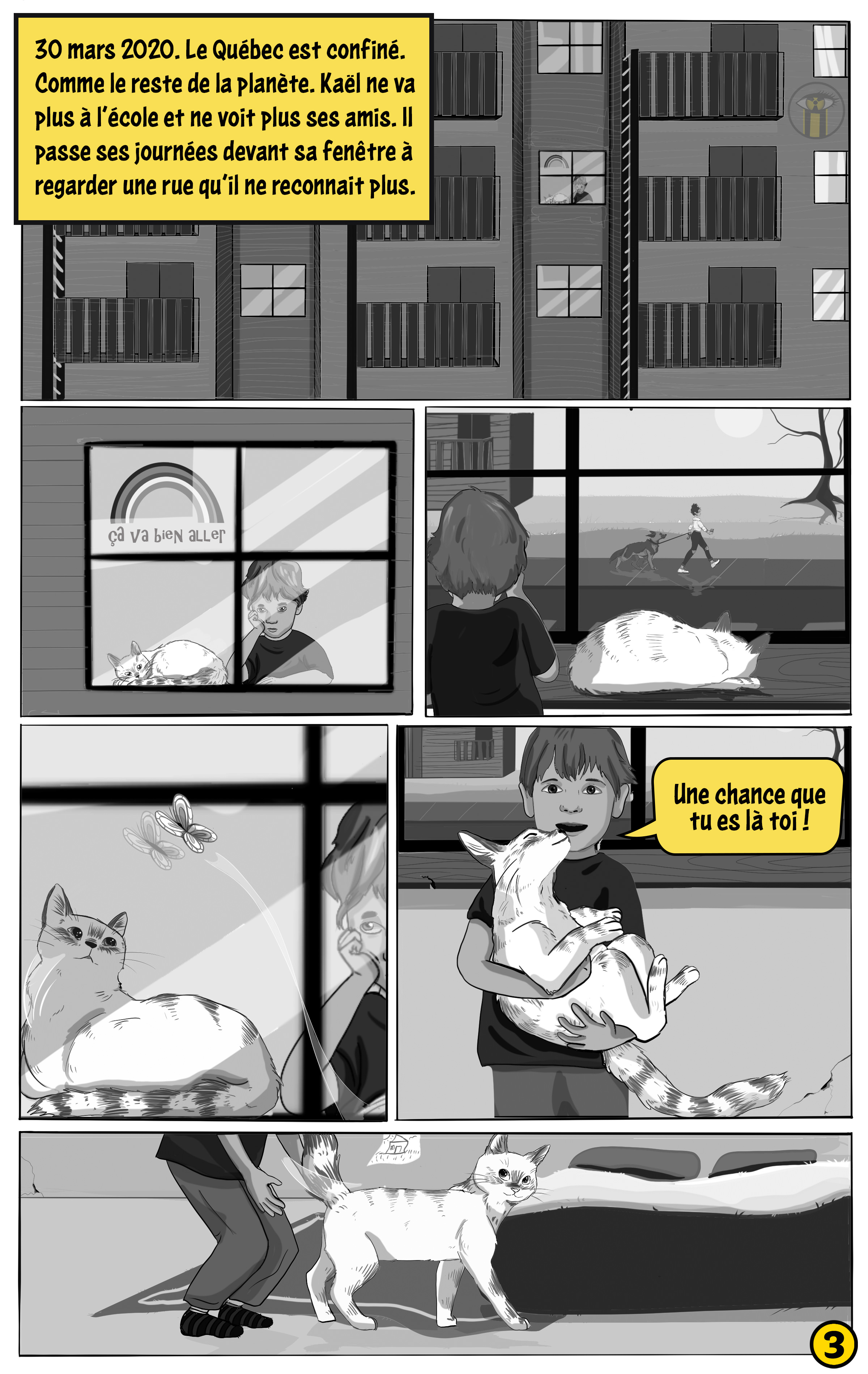 Le Québec est confiné. Kaël partage ses journées avec sa chatte à défaut de voir ses amis. Annie en profite pour se balader dans une ville fantôme. Elle rencontre son copain matou qui lui en apprend sur le COVID.