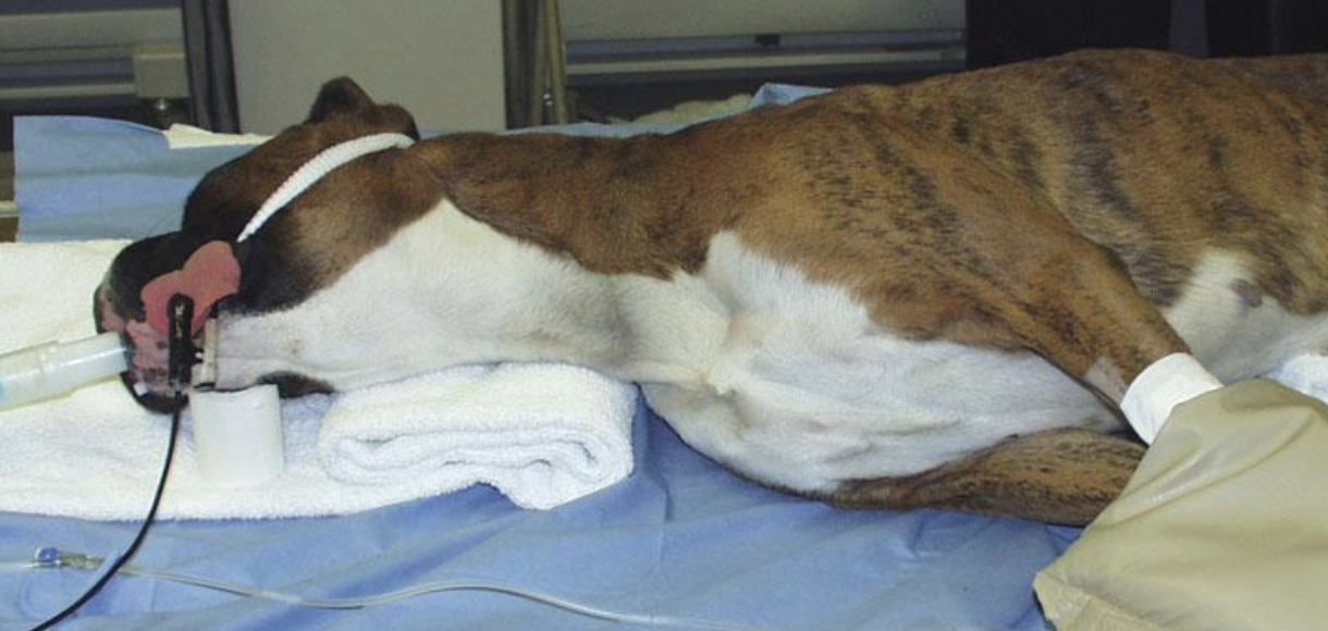 - L’animal est en décubitus dorsal et peut être dans un coussin en V.