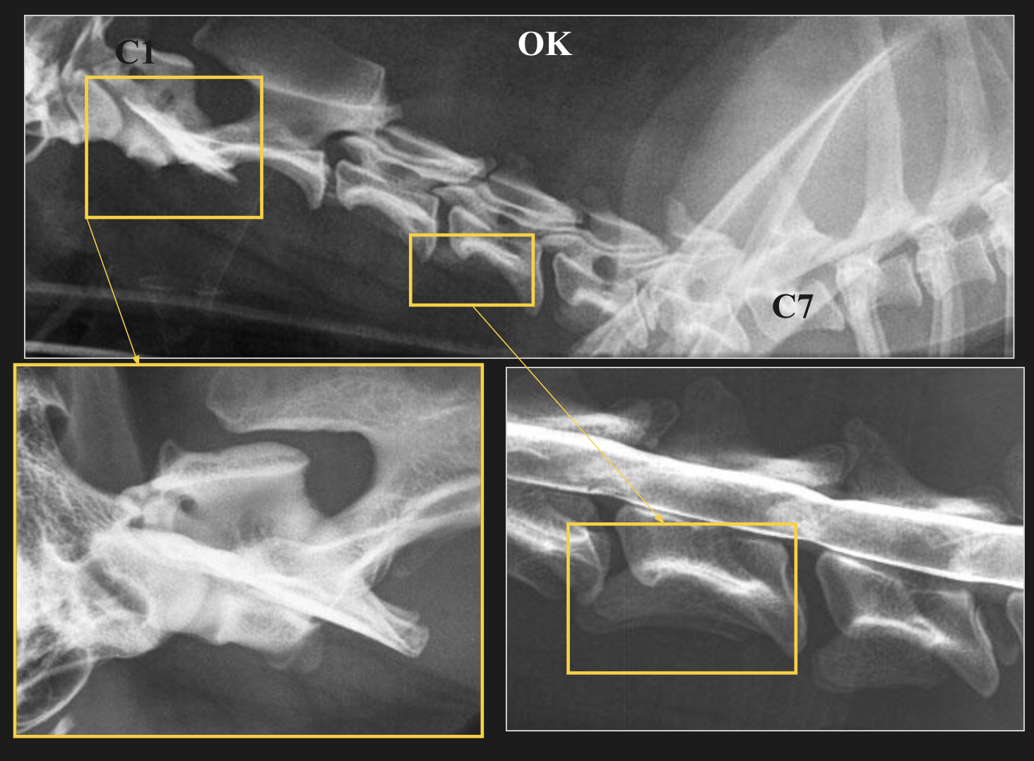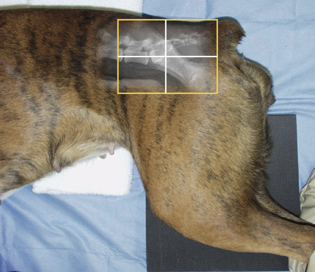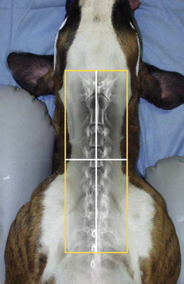 - Une fois l’animal en position radiographique, placer la règle dans l’espace intervertébral C4-C5 afin de prendre une mesure.