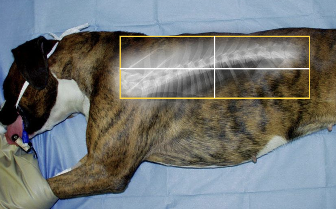 - Une fois l’animal en position radiographique, placer la règle au point le plus épais (généralement au xyphoïde) afin de prendre une mesure.